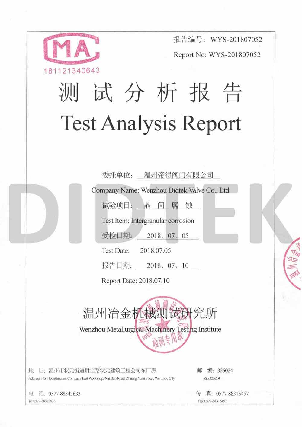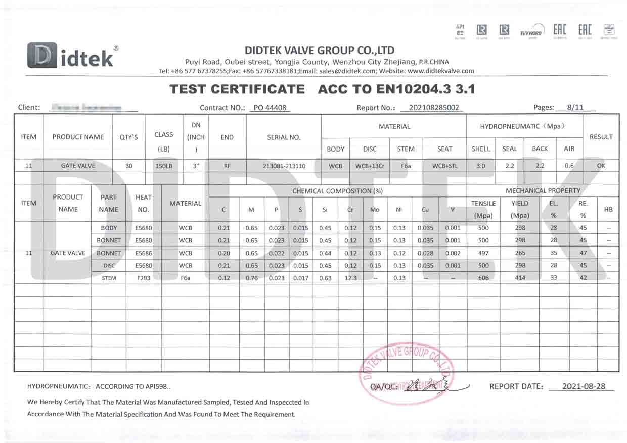 Certificado de teste da válvula de porta ACC para en10204.3 3.1