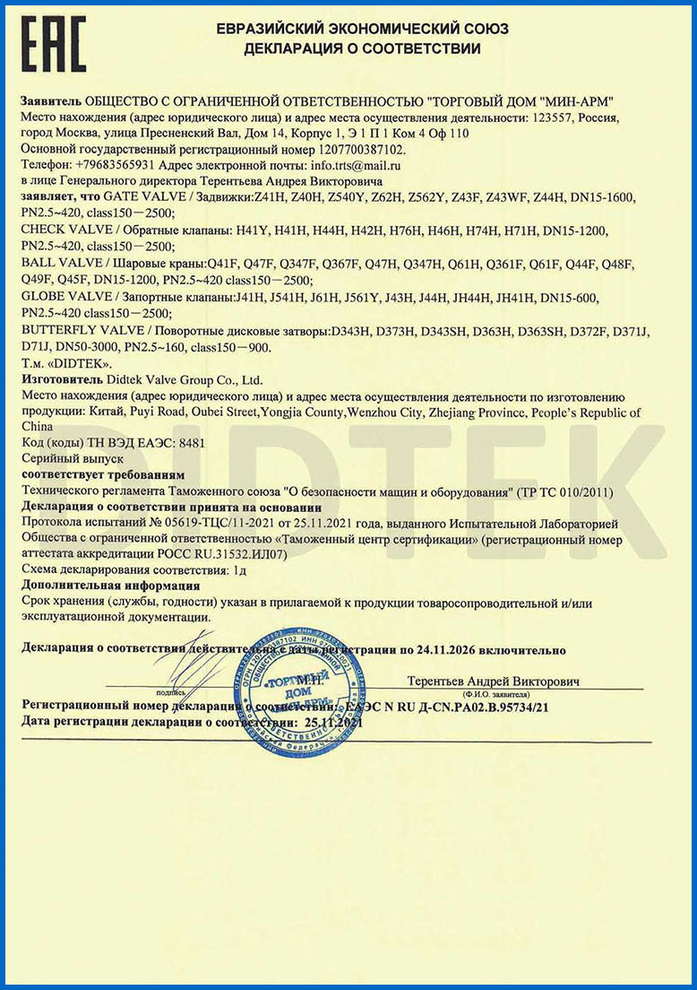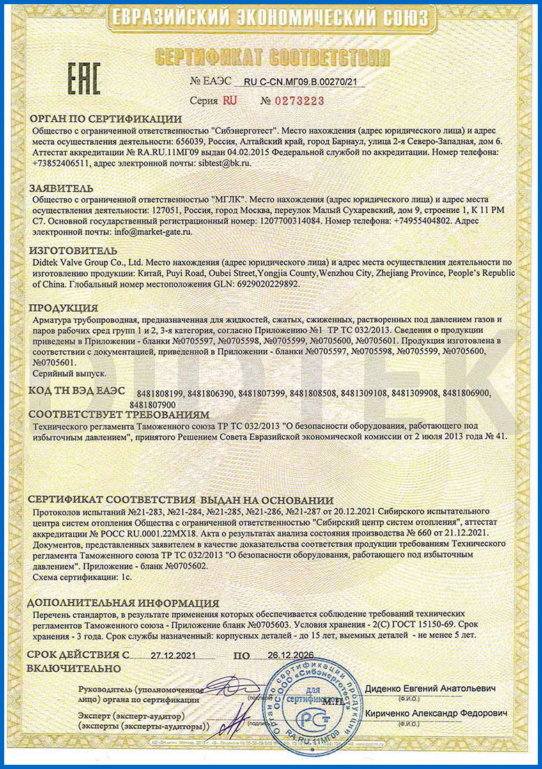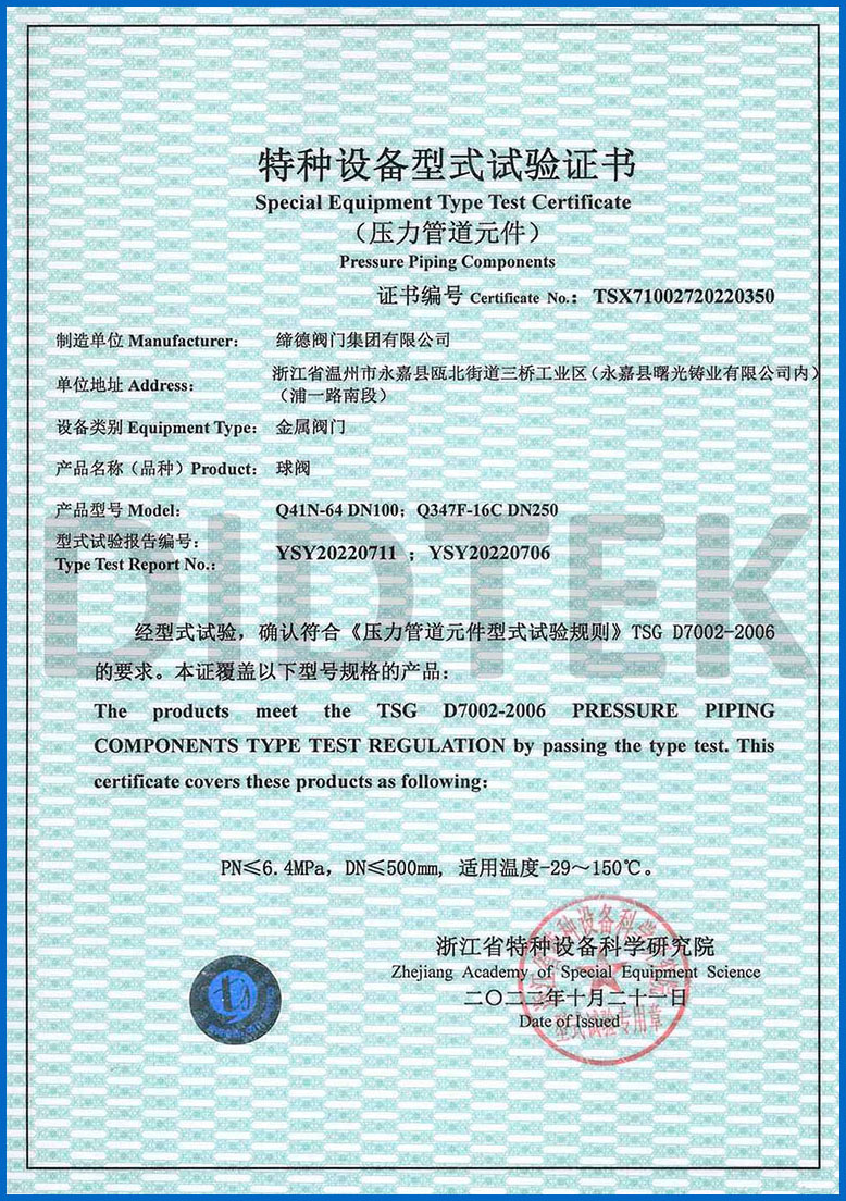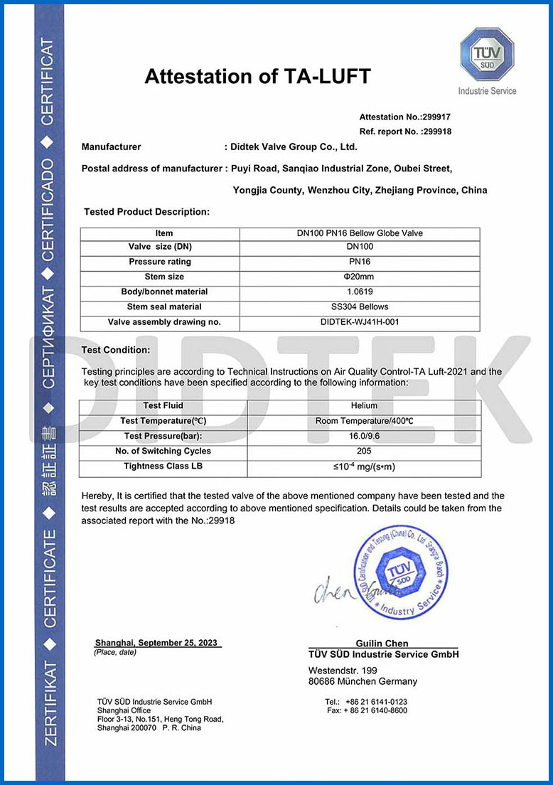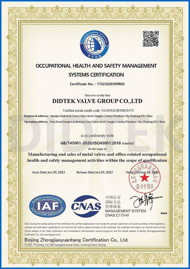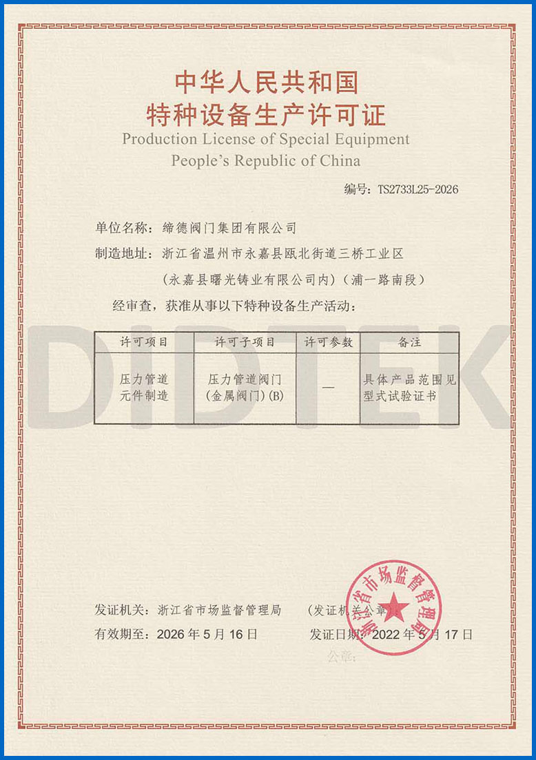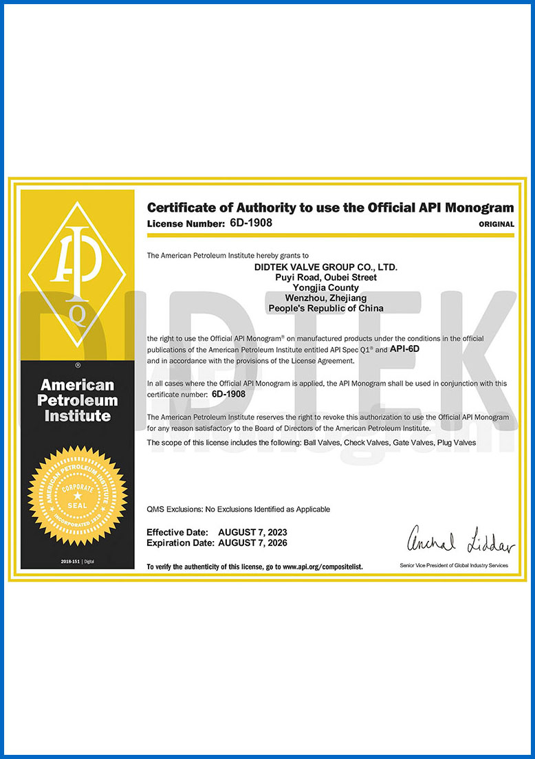 Para melhorar o reconhecimento da marca e expandir a participação de mercado da marca Didtek, nossa empresa obteve várias certificações profissionais, tanto nacional quanto internacionalmente. Essas certificações incluem a licença de fabricação de equipamentos especiais da TS China, certificado de teste de tipo de equipamento especial, certificação do sistema de gestão da qualidade ISO 9001, API 6D American Petroleum Institute 6D Certification, Certificado LRV CE EU de Lloyd CE EU 0343 Ped Modelo H, Reino Unido (Reino Unido) UKCA Segurança Certificação, certificação Russia Customs Union (EAC), Certificação de emissão fugitiva de válvula Ta-luft, ISO 15848 Valve Certificação de micro-lançamentos de emissão, certificação de incêndio da API 607, certificação de incêndio da API 6FA e outros. Essas certificações fornecem uma base sólida e garantia para a promoção da marca Didtek.