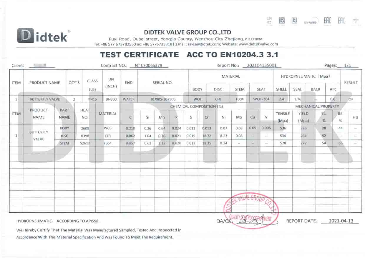 Certificado de teste de válvula borboleta ACC para en10204.3 3.1